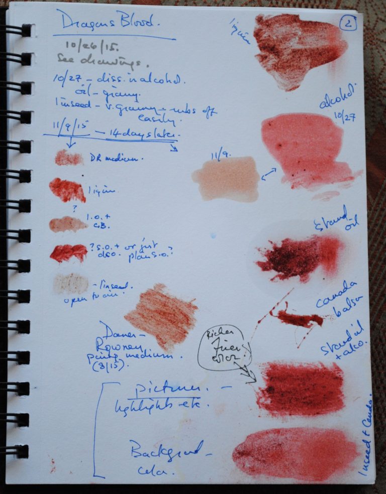 Sketchbook where I test different natural dyes. Here is it tests for Dragon’s Blood.