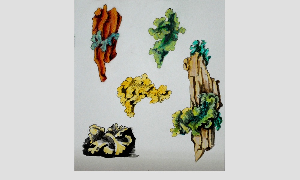 Lichen studies – ink, natural dyes, pastel – Aug 2013